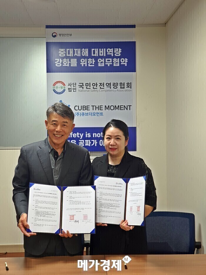 중대재해처벌법 대응 솔루션·안전보건관리체계 구축 ‘프로젝트 협력’ ISO45001 인증심사, 세미나 등 역량 결합해 시장 발굴·사업 확장키로 [메가경제=문기환 기자] (사)국민안전역량협회는 중대재해처벌법 관리 솔루션 서비스를 제공하는 플랫폼 개발 전문기업 ㈜큐브더모먼트와 지난 29일 협회 소강당(가산디지털단지 소...